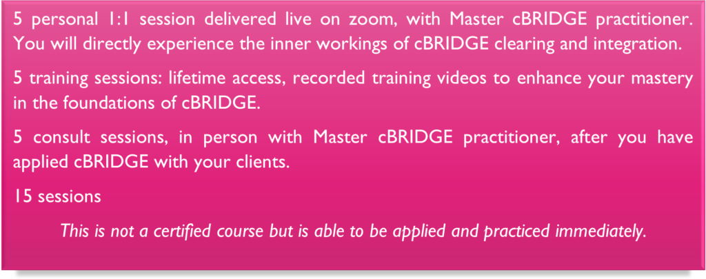 When you experience the genius and depth that this method takes you, you may want to work with others around you or offer it as a trained cBRIDGE practitioner. You may add it to your current practice but first you are to experience the transformation of cBRIDGE in your own life.