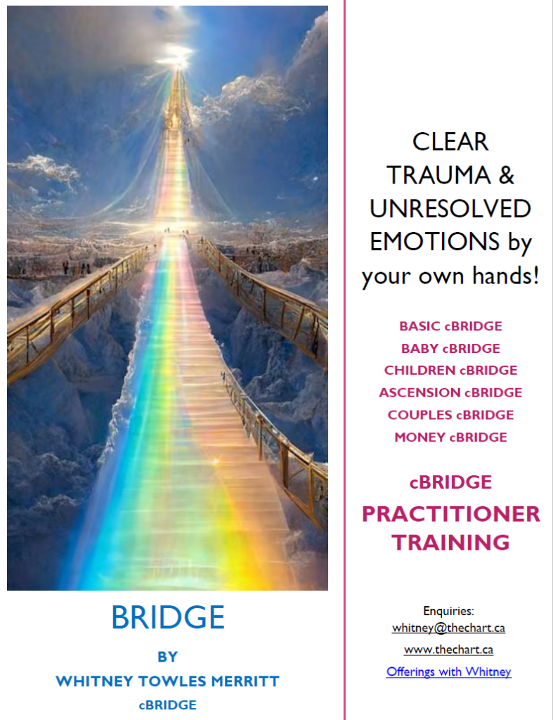 To learn cBRIDGE or become a cBRIDGE practitioner you need to clear your own vessel of emotional wounding’s. It is expected that approximately 51% of emotional clearing takes place as any reflection from unresolved issues can project in inaccurate counsel with others. Whitney takes this most seriously in her trainings. You will understand how it works and the inner interpretations of all involvements from sourcing core wound relationships from this lifetime, prior lifetimes, and indeed in-utero complexities.